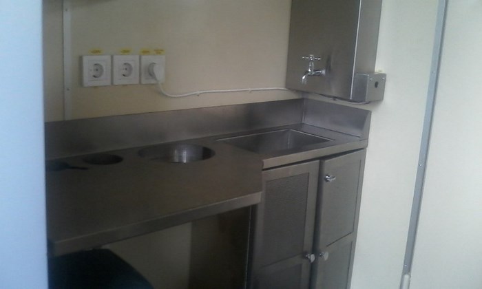 Особое внимание стоит уделить отношению к теплозвукоизоляци. Металлоконструкция изнутри покрываетьсчя специальной жидкой композитной теплоизоляцией для улучшения тепло, вибро и звукоизоляции. Пустота толщиной 50мм, между внутренней облицовкой и наружными стенками заполняется утеплителем. Облицовка выполнена в светлых тонах из качественного алюминиевого композитного материала, который обладает высокой степенью эксплуатационной надежности. Пол покрывается износостойким антискользящим транспортным линолеумом.